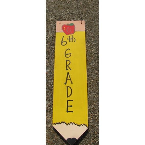 3075P6- 6th Grade Teacher, measures 12 inches long by 3 1/2 inches wide, made out of wood, hangs by wire and Handmade in America
