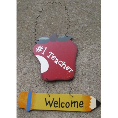 32150W - #1 Teacher Apple Welcome Pencil, measures 6 inches wide by 6 1/2 inches high and hangs by wire
