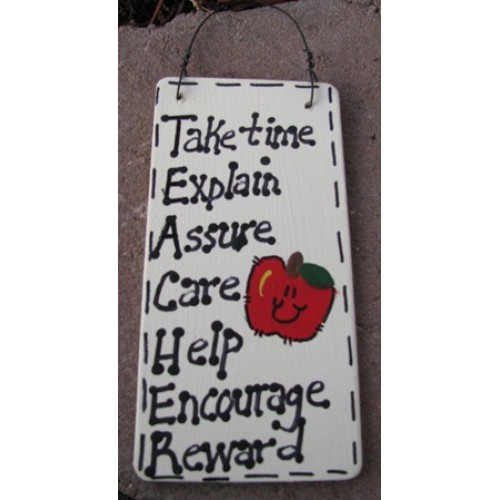 Teacher Plaque with T is Teacher E is Explain A is Assure C is Care H is Help E Encourage R is Reward. With an apple painted to the right . Hangs by wire.