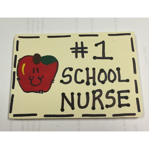 Hand Painted #1 School Nurse with apple and stitching around the edges. Wired To Hang. Teacher Gifts, measures 4 1/2 inches wide by 3 1/4 inches high. Handmade in LaPorte, TX