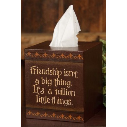 8TB302-Friendship isn't..Tissue Box, measures 5 1/4"W x 6" H x 5 1/4" D. Has the saying Friendship isn't a big thing. It's a million little things and Tissues Not Included