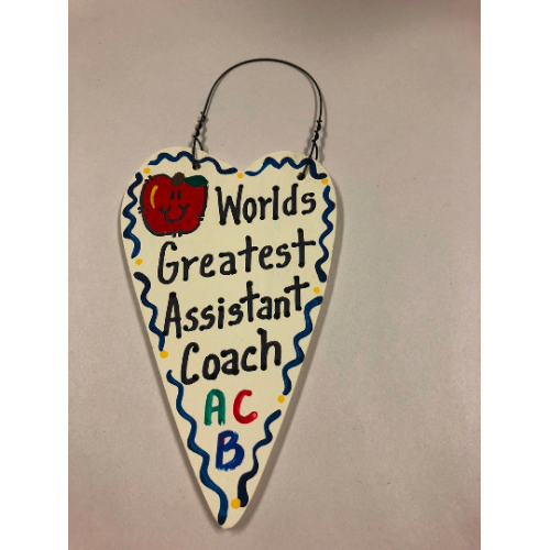 Hand Painted Teacher Gifts Says Worlds Greatest Assistant Coach Long Heart with w/Apple Hangs by Wire. Measures 6 inches high by 4 inches wide and Handmade in Texas