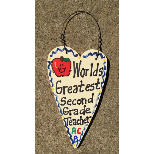 Hand Painted Teacher Gifts Says Worlds Greatest Second Grade Teacher  Long Heart with w/Apple Hangs by Wire. Measures 6 inches high by 4 inches wide.  Hangs by wire and Handmade in Texas