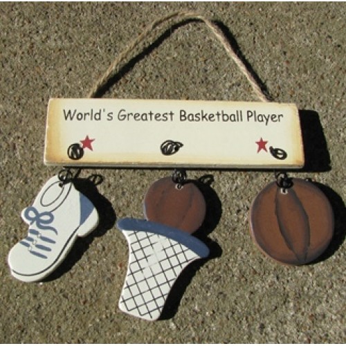 1200B Worlds Greatest Basketball Player wood sign, hangs by jute and measures 4 inches wide by 5 inches high