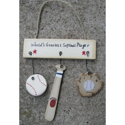 1200T World's Greatest Softball Player, measures 4 inches wide by 5 inches high, hangs by jute